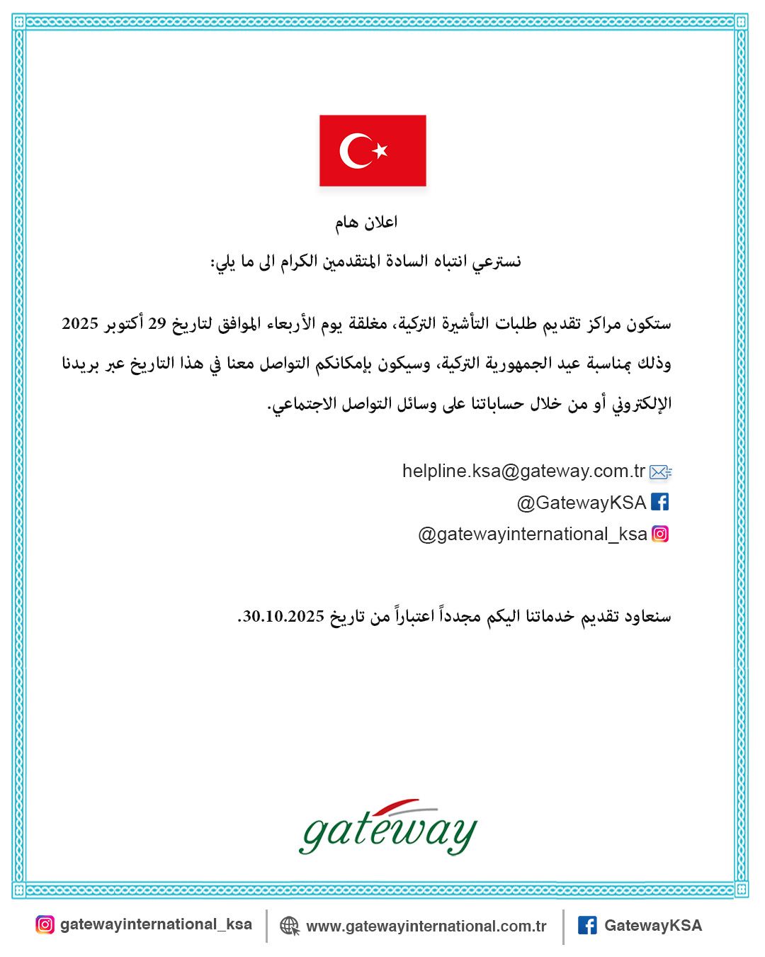 اعلان هام السادة الأعزاء المتقدين للتأشيرة التركية، نسترعي انتباهكم الى ما يلي: نود اعلامكم بان مراكزنا الخاصة للتقديم على التأشيرة التركية ستكون مغلقة اعتباراً من 26 مارس ولغاية 5 أفريل وذلك بمناسبة عيد الفطر المبارك، وسيكون بإمكانكم التواصل معنا خلال هذه الأيام عبر بريدنا الالكتروني وحساباتنا على مواقع التواصل الاجتماعي المبينة أدناه. سنستأنف تقديم خدماتنا اليكم مجدداً اعتباراً من تاريخ 6/4/2025.