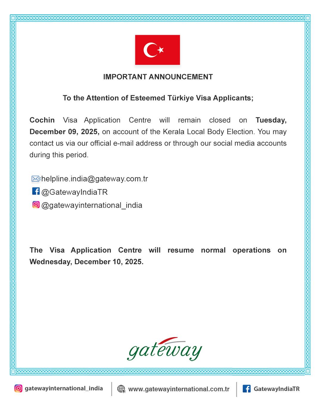 IMPORTANT NOTICE To the Attention of Esteemed Türkiye Visa Applicants; Due to the celebrations of India, our Kolkata Visa Application Center will be closed from 29 September 2025 to 2 October 2025. During the days we are closed, you may reach us via our email address below or through our social media accounts. We will resume our services from 3 October 2025.