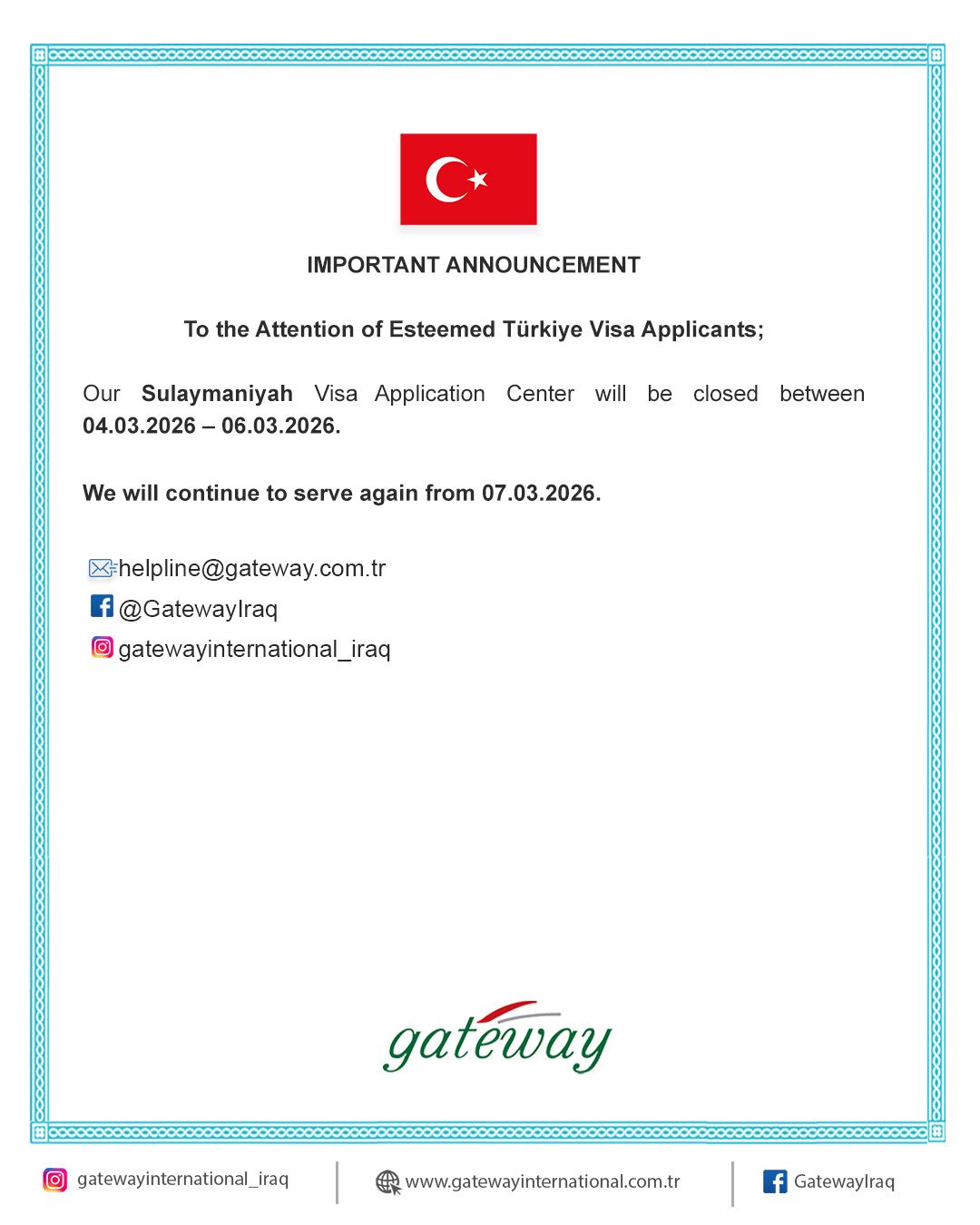 As of Monday, March 2, 2026, our Duhok Visa Application Center will resume service. Our Address: Duhok Shopping Mall, Qazi Mohammed Street, Duhok Iraq