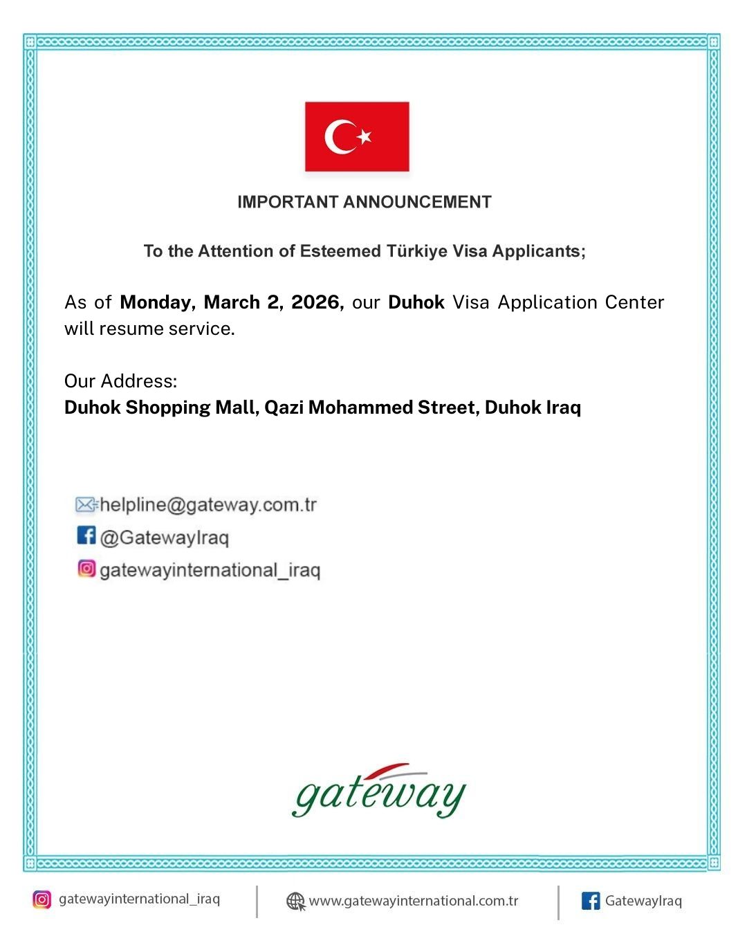 IMPORTANT ANNOUNCEMENT To the Attention of Esteemed Türkiye Visa Applicants; Due to the Eid al Fitr, we will be closed from March 29 to April 1. During the days we are closed, you can reach us via our e-mail address below or through our social media accounts. We will continue to serve again as of 02.04.2025.