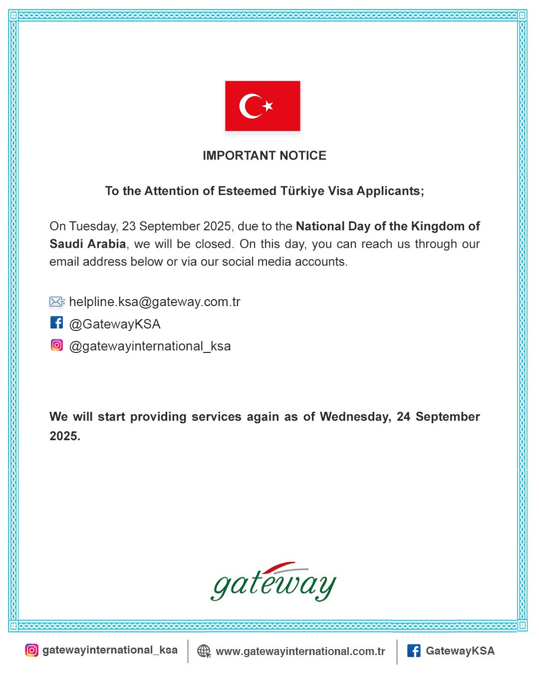 IMPORTANT ANNOUNCEMENT To the Attention of Esteemed Türkiye Visa Applicants; We would like to inform you that our offices will be closed on Sunday, 23 February 2025 due to Saudi Arabia's Foundation Day. You can contact us via our e-mail address or social media accounts. As Türkiye Visa Application Centre, we wish you a happy Saudi Arabia Foundation Day. We will continue to provide service again on Monday, February 24, 2025