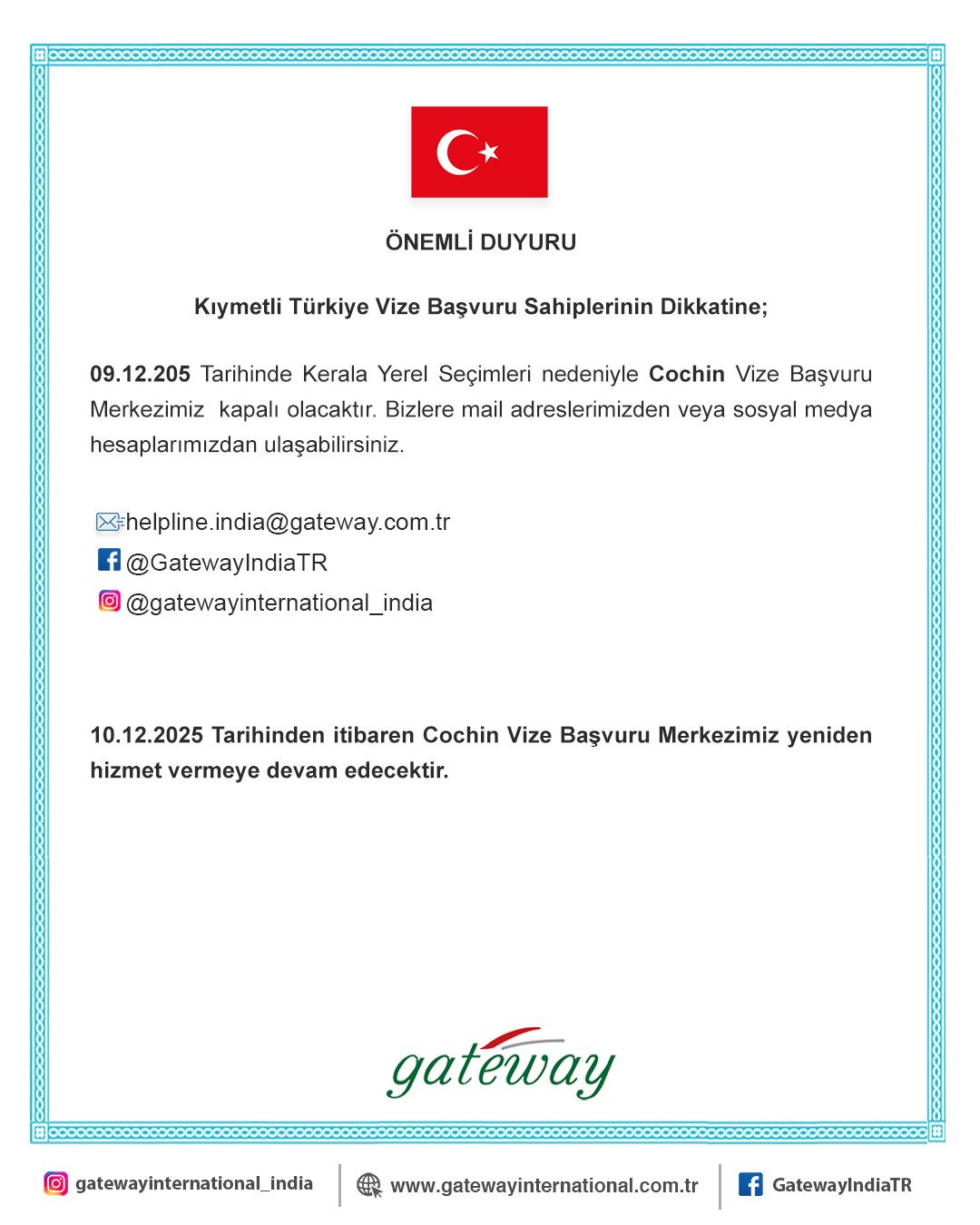 ÖNEMLİ DUYURU Kıymetli Türkiye Vize Başvuru Sahiplerinin Dikkatine; 20-23 Ekim 2025 tarihleri arasında Delhi bölgesine bağlı Vize Başvuru Merkezlerimiz kapalı olacaktır. Kapalı olduğumuz günler için bizlere aşağıdaki mail adresimizden veya sosyal medya hesaplarımızdan ulaşabilirsiniz. 24.10.2025 tarihinden itibaren yeniden hizmet vermeye devam edeceğiz.