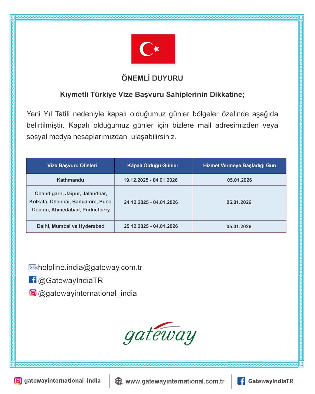 ÖNEMLİ DUYURU Kıymetli Türkiye Vize Başvuru Sahiplerinin Dikkatine; 20-23 Ekim 2025 tarihleri arasında Delhi bölgesine bağlı Vize Başvuru Merkezlerimiz kapalı olacaktır. Kapalı olduğumuz günler için bizlere aşağıdaki mail adresimizden veya sosyal medya hesaplarımızdan ulaşabilirsiniz. 24.10.2025 tarihinden itibaren yeniden hizmet vermeye devam edeceğiz.