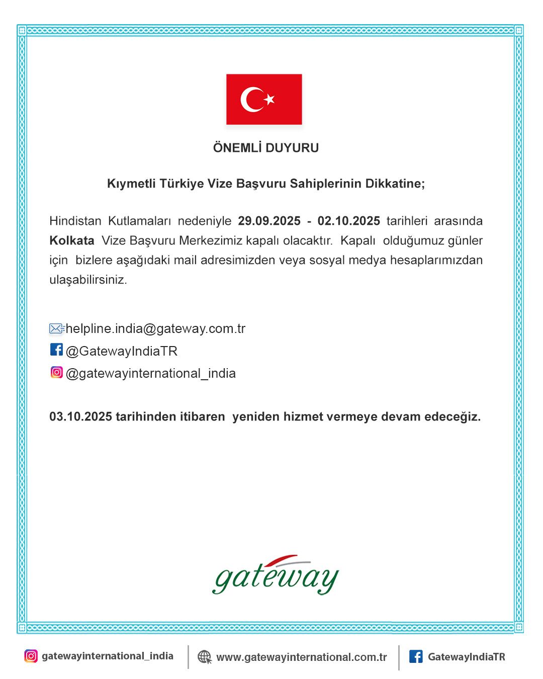 ÖNEMLİ DUYURU Kıymetli Türkiye Vize Başvuru Sahiplerinin Dikkatine; Kurban Bayramı tatili nedeniyle 06.06.2025 tarihinde Mumbai bölgesindeki Türkiye Vize Başvuru Merkezlerimiz kapalı olacaktır. Kapalı olduğumuz gün için bizlere aşağıdaki mail adresimizden veya sosyal medya hesaplarımızdan ulaşabilirsiniz. 09.06.2025 tarihinden itibaren Mumbai bölgesinde, yeniden hizmet vermeye devam edeceğiz.