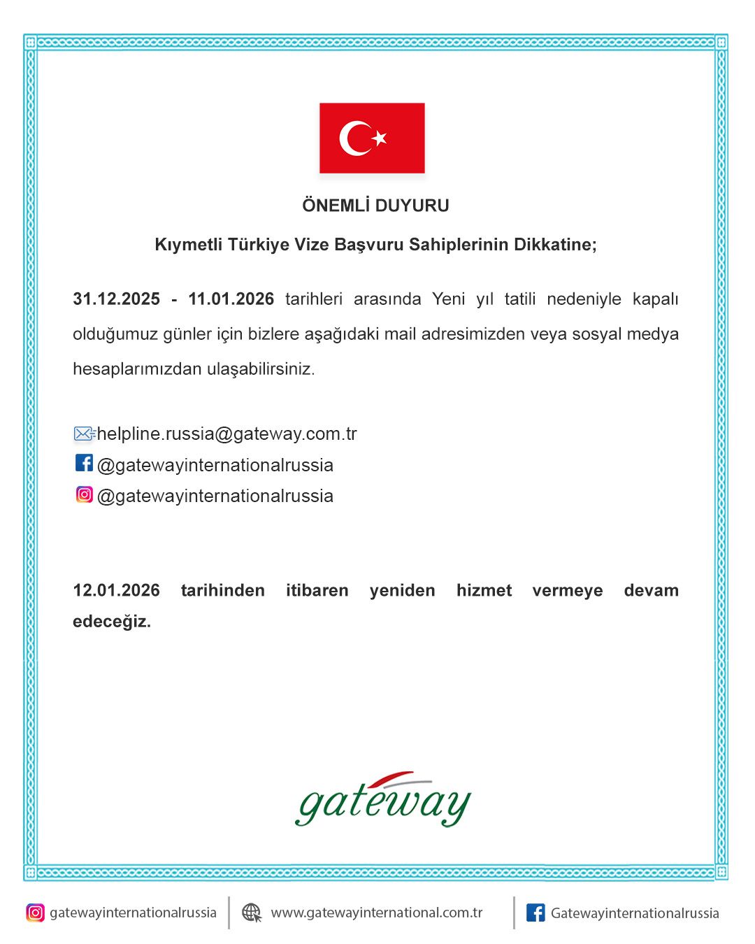 ÖNEMLİ DUYURU Kıymetli Türkiye Vize Başvuru Sahiplerinin Dikkatine; 03.11.2025 – 04.11.2025 tarihleri arasında Rusya Ulusal Birlik Günü nedeniyle Türkiye Vize Başvuru Merkezlerimiz kapalı olacaktır. Bizlere e-posta adresimizden veya sosyal medya hesaplarımızdan ulaşabilirsiniz. 05.11.2025 tarihinden itibaren yeniden hizmet vermeye devam edeceğiz.