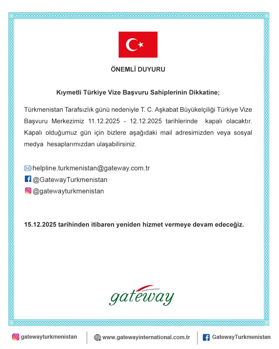 Değerli Başvuru Sahiplerimiz; Türkmenistan Anayasa Günü ve Bayrak Bayramı nedeniyle Türkmenistan makamları tarafından resmi tatil ilan edilen 19 Mayıs 2025 Pazartesi günü, T.C. Aşkabat Büyükelçiliği Türkiye Vize Başvuru Merkezi kapalı olacaktır. Bizlere aşağıdaki mail adresimizden veya sosyal medya hesaplarımızdan ulaşabilirsiniz. 20.05.2025 tarihinden itibaren, Salı günü yeniden hizmet vermeye devam edeceğiz.